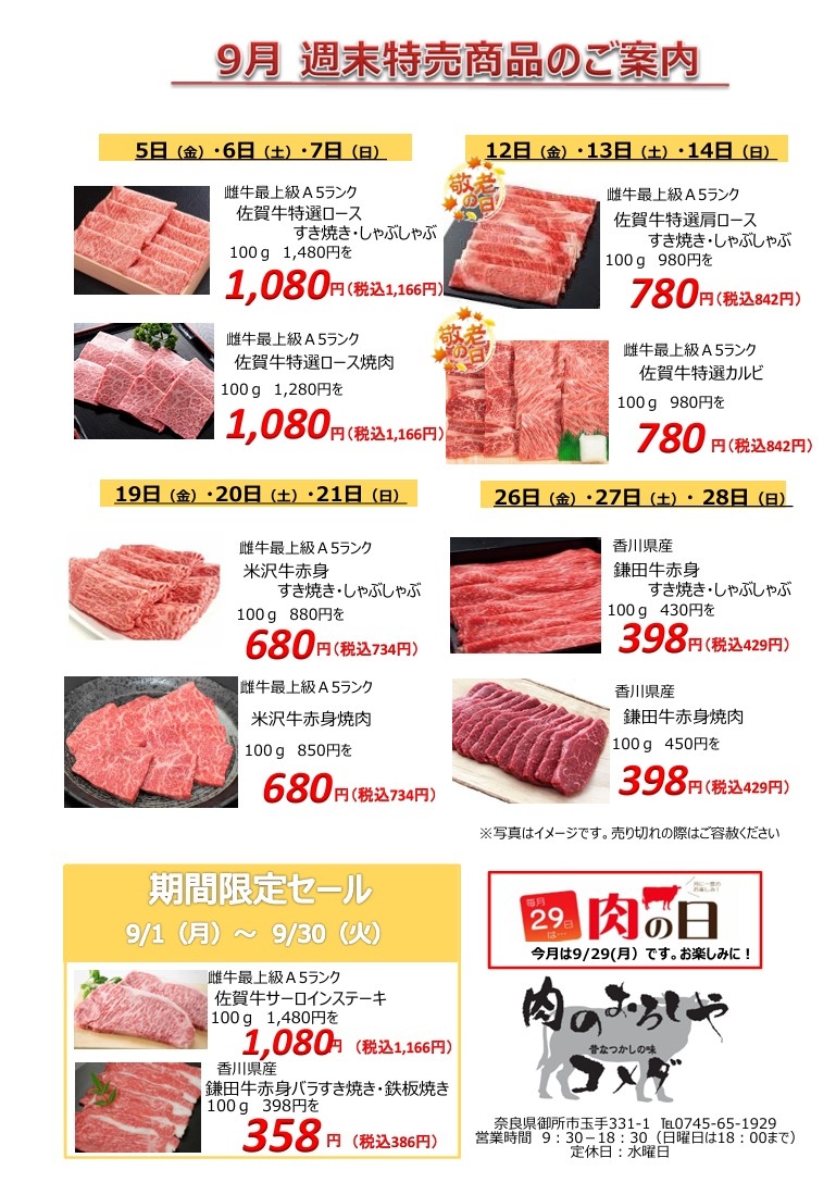 肉のコメダ 学園前店です♪9月も最上級A5ランク 雌牛 米沢牛・佐賀牛香川県産鎌田牛 を週末お買い得..